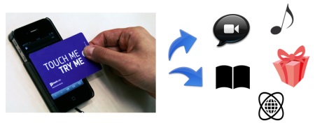 - 飲料メーカーの例 : 会員に複数のタッチコードカード入りのダイレクトメール(DM)を送付。会員がスマホやタブレット端末で専用サイトへログインして各カードをかざすと、各商品の特長が動画で表示される。会員が飲んでみたい銘柄を選ぶと、そのサンプルが後日配送され、トライアルプロモーションの活性化につなげることができる。