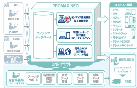 DNPは、サーバーでコンテンツを一元管理し、各部門がウェブ経由でアクセスして印刷物の制作と承認手続きを行うPROMAXシリーズを提供してきました。今回、紙メディアだけでなくデジタルメディア向けコンテンツの制作に対応したPROMAXNEOを開発し、企業の業務効率化とクロスメディアコミュニケーションの支援を強化します。