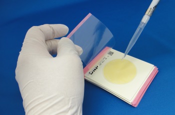 前処理不要の調製済み培地のため、外装のアルミ袋から取り出してすぐに使用でき、緊急の検査などにも迅速に対応できます。また、検査する食品などを希釈した試料液を培養エリアの中央に滴下し、カバーフィルムを閉じるだけで試料液が培養エリア全体に広がってゲル化するため、効率的に作業を進めることができます。