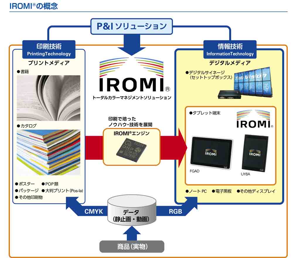 DNPは1876年の創業以来、印刷物をはじめとするコミュニケーションツールの企画・制作に携わり、その品質を高めてきました。DNPは、長年培ってきた“正しい色の再現”に関わるカラーマネジメント技術のノウハウを活かし、ディスプレーで実物に合わせた色再現を追求した、DNP独自のトータルカラーマネジメントソリューションの考え方である「IROMI®」を提唱します。
