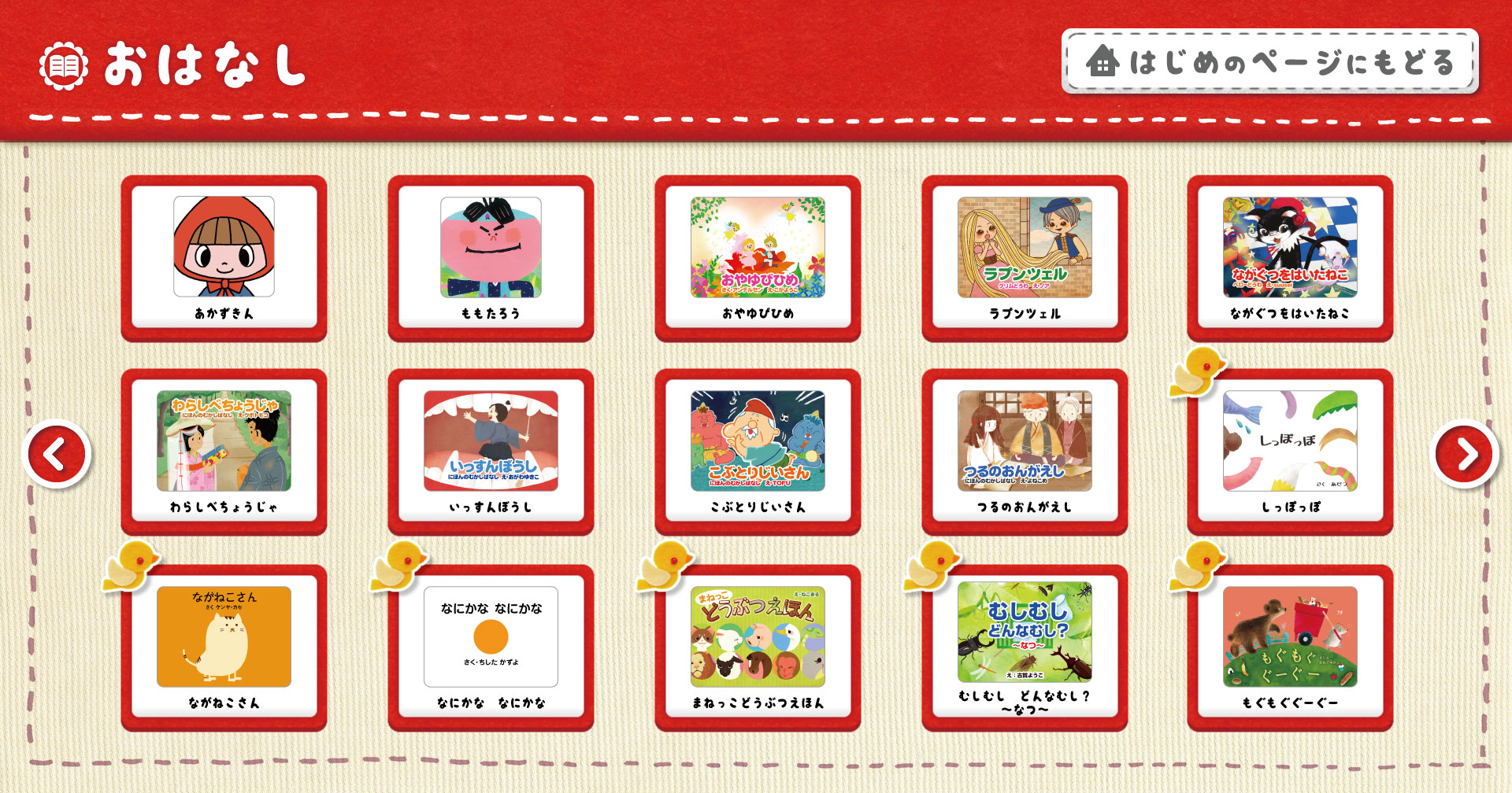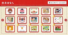 おはなし | 「あかずきん」「わらしべちょうじゃ」 「ながねこさん」など、計45コンテンツ | 「しらゆきひめ」「はなさかじいさん」 「不思議の国のアリス」など、計45コンテンツ |