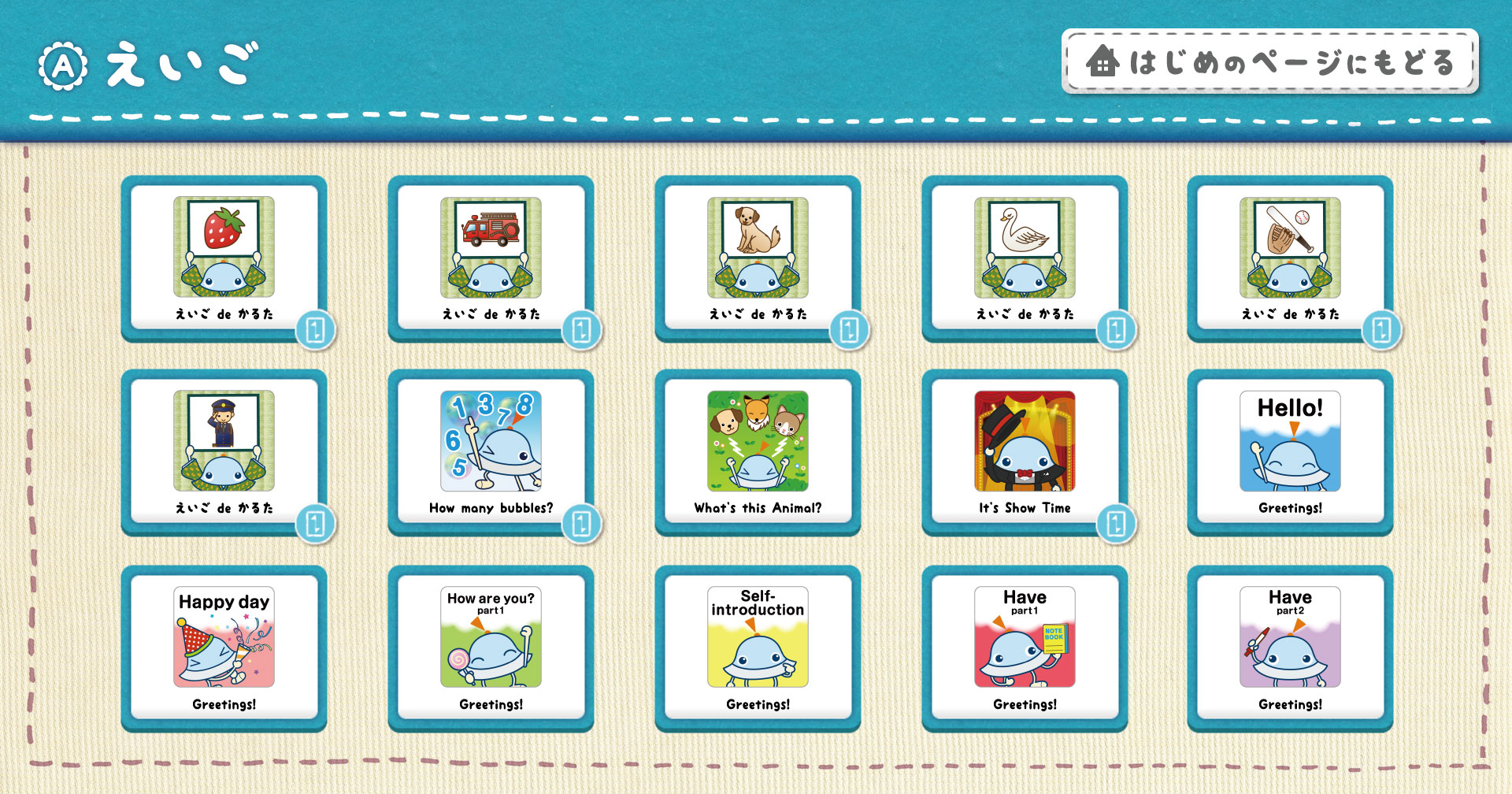 えいご | 「How many bubbles?」「Greetings ?Hello!」など、 計15コンテンツ | 「papachi catcher!」 「えいごdeかるた-Food&Drinks」など、 計15コンテンツ |