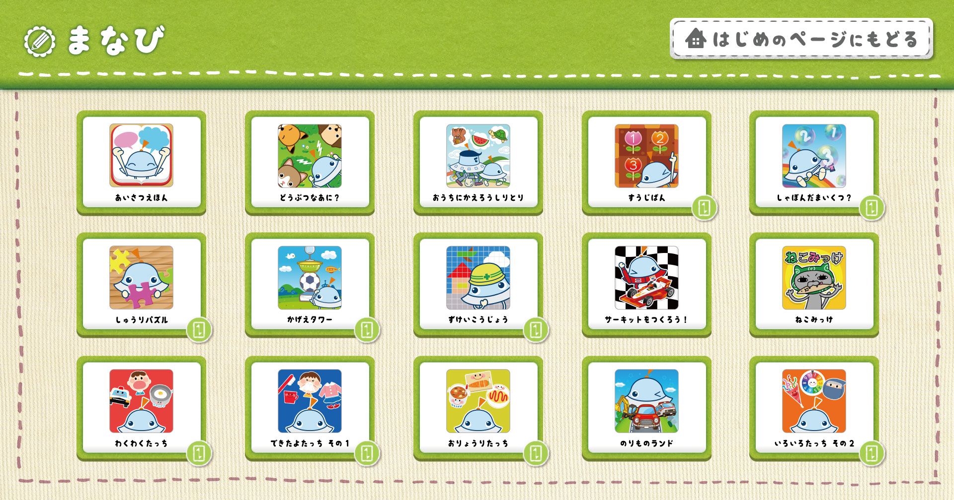 まなび | 「ねこみっけ」「すうじばん」など、 計15コンテンツ | 「きらきらもじ」「くらべてみよう」など、 計15コンテンツ |