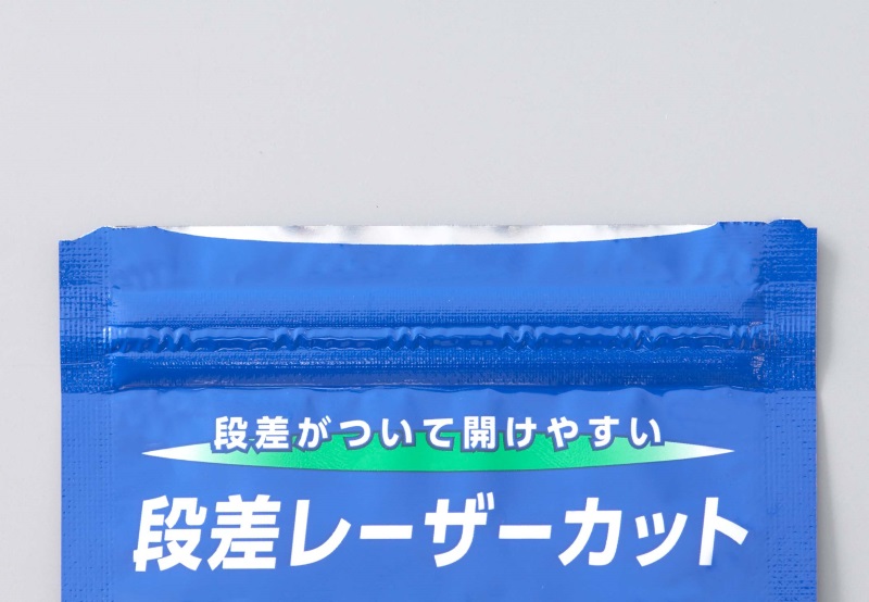 段差レーザーカットパウチはさまざまな用途や袋の形状に対応できます。内容物の保護やフィルムの引き裂き易さなどに留意し、表面の基材にPETフィルムを、バリア層にアルミ箔を使用しています。