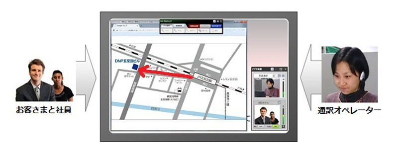 DNPオリジナルタブレット端末と、5つの言語に対応する通訳オペレ-ターがいるコールセンターをインターネットのWeb会議システムを利用して繋ぎ、外国人の問い合わせに対して受付窓口担当者がタブレット端末を操作し、オペレ-ターが画面上で両者の話を通訳しながら対面で案内するサービスです。
