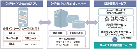 - 企業は、DNPの提供する各種O2O(Online to Offline)サービスなどを活用することによって、容易にDNPモバイルWalletサービスに対応した様々なサービスを立ち上げることができます。