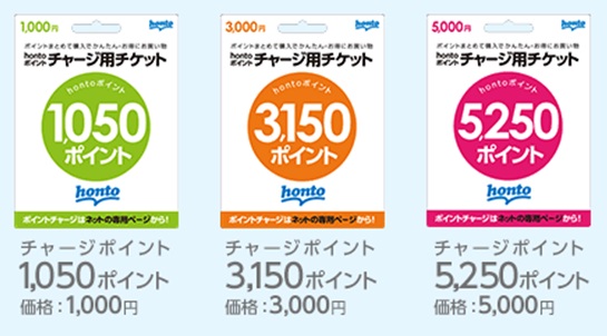 hontoポイントチャージ用チケットに記載されている16桁の数字(チケットコード)とPINコードを、honto.jpサイトのhontoポイント交換ページ(http://honto.jp/service/giftcard)で登録することで、hontoポイントを貯めることができます。1,000円、3,000円、5,000円の3種類のチケットを販売します。販売価格の5%を上乗せしたhontoポイントで書籍などが購入できます。