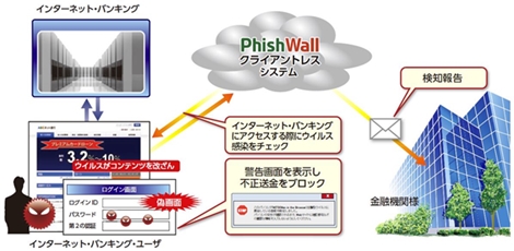 セキュアブレインが開発した「PhishWallクライアントレス」は、利用者のパソコン等の端末にソフトウエアのインストールが不要なため、導入している金融機関のインターネットバンキングサイトにアクセスするすべての利用者にウェブブラウザーでの通信の盗聴や改ざんを行うウイルスの攻撃を検知・防止するセキュリティ対策を提供することが可能なシステムです。ウイルス感染による不正送金被害の拡大を受け、NTTデータ、セキュアブレイン、DNPは「PhishWallクライアントレス」を、NTTデータが提供する「AnserParaSOL」、「AnserBizSOL」において利用可能とするサービスを3社で提供することとしました。