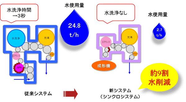 ・ ペットボトル成形機と充填機を一体化し、成形時の余熱を使用した温風での乾燥(エアリンス)時間を長くすることで、これまで滅菌用の過酸化水素などを除去するために行っていた無菌水によるボトル内の洗浄工程を不要としました。これにより、成形機と充填機が分かれていた以前のシステムと比較して、水の使用量を24.8t/hから2.7t/h(1分間に600本の充填が可能なシステムでの換算)と約9割削減しました。