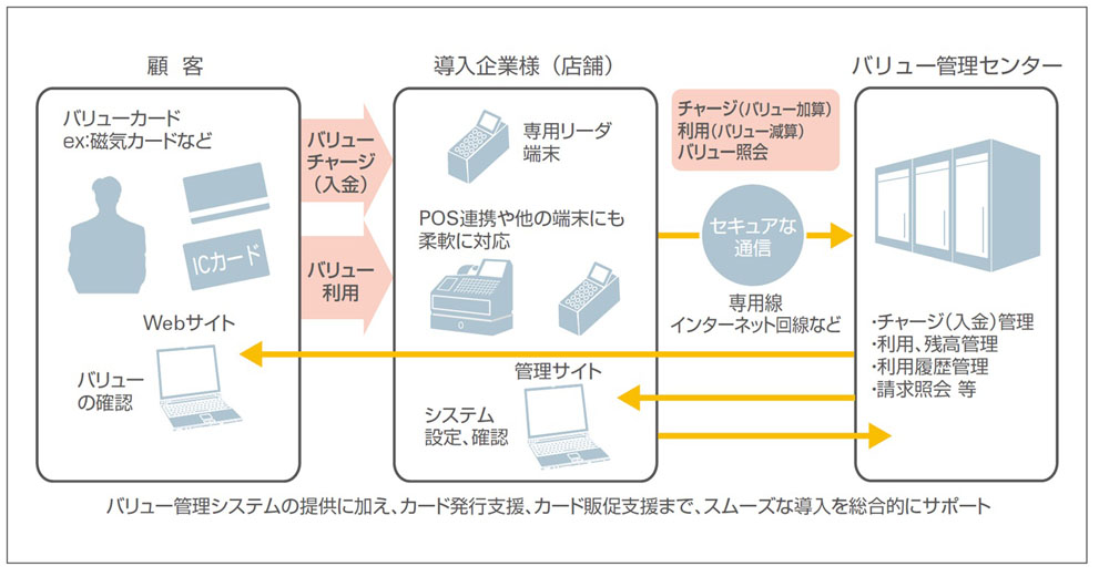 VALUE TACTiXは、プリペイドカードの残高管理を行うクラウド型サービスです。店頭に設置したカードリーダーで残高の加算・減算が行えるほか、パソコンやスマートフォンなどから会員向けWebサイトにアクセスして残高を確認することもできます。生活者が通販サイトでプリペイドカード決済を行う場合は、カード番号とPIN(個別認識用番号)を入力するだけで、残高の範囲内で商品を購入できます。