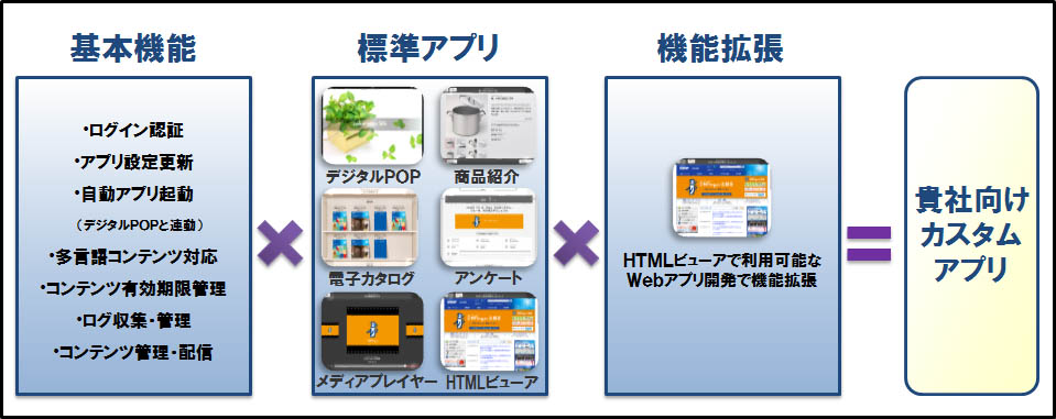 ○販売促進支援機能 : 電子カタログ、アンケート、デジタルPOP、商品紹介、動画・音声再生(メディアプレーヤ)、各種コンテンツ制作、HTMLビューアでの企業ウェブサイトや独自コンテンツの表示など、企業の販売促進に必要な機能を標準的に利用できます。そのほか、企業のニーズに合わせた機能拡張なども行い、各社のサービスに最適なカスタマイズを実現します。