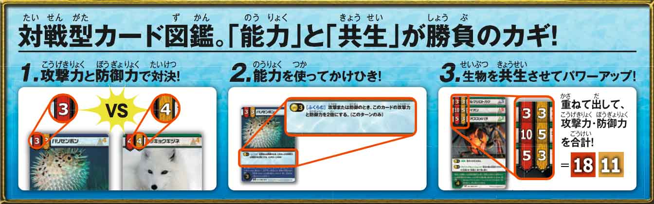 内容 | ■スターターパック 陸デッキと海デッキが各30枚、合計60枚(生物20種)のカード入り。(2人分) ○陸デッキ(30枚):「オカダンゴムシ」2枚、「タケ」2枚、「グンタイアリ」2枚、「オオスズメバチ」1枚、「オグロヌー」2枚、「アルマジロトカゲ」2枚、「フィリピンメガネザル」1枚、「ホッキョクギツネ」2枚、「ブラックマンバ」1枚、「ライオン」1枚、「陸」7枚、「エネルギー」7枚○海デッキ(30枚):「植物プランクトン(海)」2枚、「クリオネ」2枚、「ガンガゼ」2枚、「オニヒトデ」1枚、「オニイトマキエイ」2枚、「モンハナシャコ」2枚、「スベスベマンジュウガニ」1枚、「ハリセンボン」2枚、「イッカク」1枚、「ホホジロザメ」1枚、「海」7枚、「エネルギー」7枚*うち「ホホジロザメ」と「ライオン」の2枚は、ホログラムで装飾された“キラカード”です。*プレイシート2枚、プレイガイド1枚、ライフカウンター4個が付いています。■ブースターパック 追加コレクションや自分だけのオリジナルデッキ作りを楽しむための商品です。 生物カード80種(キラカード8種、ノーマルカード72種)とみなもとカード10種(「陸」「海」「川」各3種、「エネルギー」1種)の全90種の中から、ランダムに選ばれた15枚がセットで1袋となった商品です。2袋に1枚の割合で“キラカード”が登場します。 |