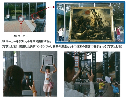 AR(Augmented Reality:拡張現実)技術を活用し、美術作品の画像をタブレット端末のカメラで写している実際の風景に合成して写真にとることができるアプリです。識別用のARマーカーが印刷されたパネルをタブレット端末で撮影すると、マーカーの画像が、あらかじめ選択した美術作品の画像と入れ替わって表示されます。作品のサイズは、その場所に置かれた場合の実物大で表示されるので、空間と美術作品、見る人と美術作品の対比や関係性を考えるシナリオとして展開しています。目の前の風景の中に美術作品が出現する楽しさから、美術にあまり馴染みのない人々に、美術そのものへの関心を向けさせることもできます。