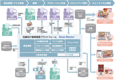 このニーズに対してDNPは、情報の一元管理と様々なメディアへの展開を実現するプラットフォームを流通各社に提供し、複雑化する販売・販促業務の効率化と販促効果の向上を実現します。
