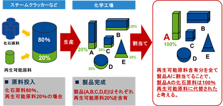 - BASFの工場で製造する製品の原料として投入する石油由来原料の替わりに、1.で算出した必要量の再生可能原料を投入します。
