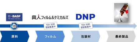実際にはナイロン樹脂の製造に再生可能原料は含まれていませんが、他の製品で使用した再生可能原料を厳密に管理し、第三者認証機関が製造や管理システムの監査を行うことで、ナイロンフィルムに再生可能原料による石油代替効果を付与します。BASF、KJFC、DNPの3社は、各製造工程で第三者認証機関であるTÜVSÜD(テュフズード 本社:ドイツ)の認証取得を進めています*。