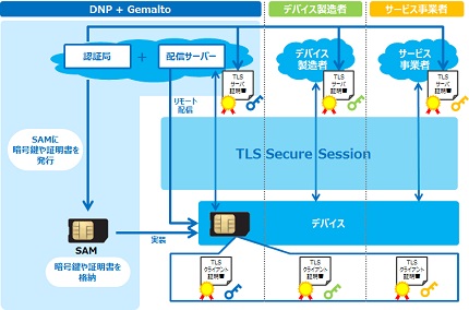具体的には、本プラットフォームでは、IoT用のデバイスとサーバー間の通信において、インターネットで標準的に利用されているプロトコルであるTLS(TransportLayer Security)*2を用います。TLSの相互認証に用いる暗号鍵やデジタル証明書を、耐タンパ性の高いSAM(SecureApplication Module)*3に格納することで、不正アクセスや改ざんを防止し、より安全にデバイスとサーバー間の相互認証を行うことが可能になります。また、暗号鍵やデジタル証明書、アプリケーション等をセキュアに配信するサービスも行います。本プラットフォームにより、IoT用のデバイスと通信のセキュリティを向上させ、より安心・安全なIoTのエコシステムを実現することが可能になります。