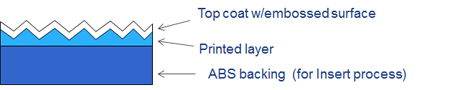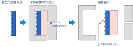 成形工程において、熱と圧力を加飾フィルム表面の保護層が吸収し、成形後に表面保護層を除去することで、フィルム表面の凹凸を維持した成形品が完成します。