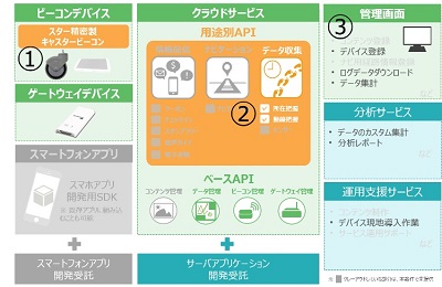 本サービスは、カート等に搭載したBluetooth対応のキャスタービーコン(スター精密が開発)が電波を発信し、施設内の受信機を介してクラウドサーバーがカート等の位置情報を集約することで、その現在位置や動線を可視化するものです。DNPが開発した位置情報に特化したIoTプラットフォームを使用しています。大規模施設でのサービス有効性に関する実証実験については、成田国際空港株式会社(以下:成田空港)にご協力いただきました。