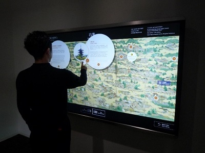 DNPが2014年に「洛中洛外図屏風(池田本)」(六曲一双、林原美術館蔵)の高精細複製「伝匠美」制作時に撮影した高精細デジタルデータを活用し、屏風上に表現されている史跡・名所の説明や、歴史的背景などの過去から現代における多面的な情報を、鑑賞者が興味に応じて選択して鑑賞できる多言語マルチメディアシステムです。※本展では日本語・英語の2ヶ国語に対応しています。