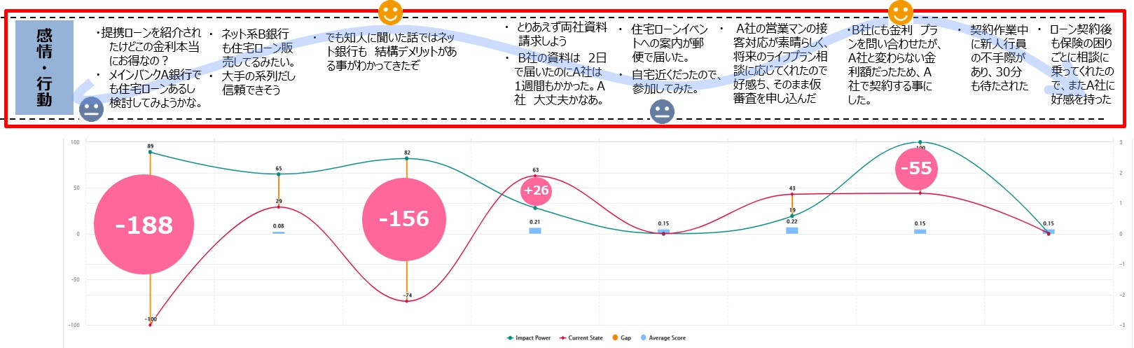 デジタルマーケティングで使うCJM上に、NPSに基づく“感情解析手法”で得られた“Impact Power LINE”(下図青線)と“Current state”(下図赤線)の2つの数値のギャップを表示して、実施すべきマーケティング施策の決定を支援します。