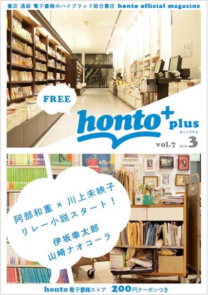 2013年7月に創刊した『honto+』は、ハイブリッド型総合書店「honto」の便利な利用方法や、honto提携書店の各書店員がオススメする書籍の紹介のほか、伊坂幸太郎氏のコラムや山崎ナオコーラ氏の小説など、人気作家の書き下ろし作品を収録しているフリー(無料)マガジンです。店頭で配布する紙版だけの特典として、honto電子書籍ストアで500円(税込)以上の電子書籍を購入する際に利用できる200円クーポンが付いています。