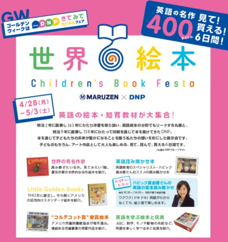 4/28(月)~5/3(土)、2Fイベントゾーンで、丸善 丸の内本店の洋書のスペシャリストが厳選した英語の絵本・約400タイトルのほか、子ども英語教育のスペシャリストであるハビック真由香さんのおススメ英語絵本、英語を学ぶ絵本や知育玩具などを展示します。子どもだけでなく、アート作品として大人も楽しめる、“見て、読んで、購入できる”イベントです。