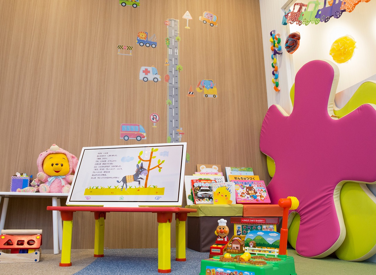 今回、東芝ライフスタイル株式会社製の24型液晶ディスプレー搭載タブレット端末「SharedBoard(シェアード・ボード)」注1にデジタルえほんのパッケージをインストールし、「パークシティ武蔵小杉 ザ ガーデン タワーズイースト」のレジデンシャルサロン内モデルルーム来場者が見学中に子供を預けることができる、キッズスペースとモデルルームの2ヶ所に端末を設置します。複数の人が同時に操作できる大型の端末で、保育者と子供または子供同士でコミュニケーションを図りながら利用できます。
