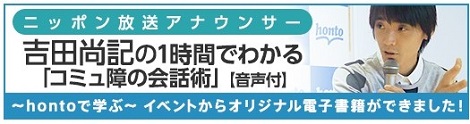 紙と電子の両方の書籍に対応したハイブリッド型書店サービス「honto(ホント)」を展開する大日本印刷(DNP)は、トゥ・ディファクトと共同で、電子書籍ストア「honto.jp(ホントドットジェーピー)」において、honto完全オリジナルの電子書籍『ニッポン放送アナウンサー吉田尚記の1時間でわかる「コミュ障の会話術」【音声付】』を2015年11月27日(金)に独占販売を開始します。