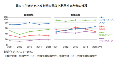 既婚男性のうち加工食品を購入する人の割合は、2002年の50.2%から、2014年には66.6%に増加しました。また、既婚男性の食品スーパー、ドラッグストアの利用率が伸びる一方、職業を持つ既婚女性(有職主婦)ではコンビニエンスストアの利用が伸びています(図1)。共働きなどで男性の家事への関わり方が変わることにより、家庭の買い物のスタイルも変化してきており、店舗の利用の仕方も多様化しています。