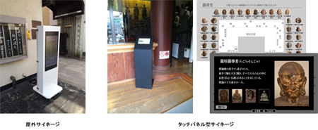 拝観コースには、タッチパネル型サイネージ3台と、イーゼル型のスタンドに設置した43インチサイネージ2台、合計5台のデジタルサイネージシステムを設置し、歴史ストーリー映像及び文化財解説コンテンツを多言語*で配信します。