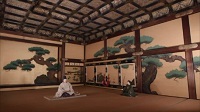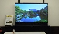 DNPが開発した超短焦点プロジェクター用の自立式筐体を設置し、「京都・文化遺産アーカイブプロジェクト」*1で撮影した映像作品のなかから、二条城の唐門や国宝二の丸御殿の障壁画空間など二条城の見どころのダイジェスト映像を5分程度に特別に編集し、繰り返し再生します。世界文化遺産の高精細な4K映像を100インチの大画面でご覧いただくことができます。
