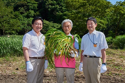 返還式で岸先生はこれまでの活動の経緯を説明し、「小網代の谷の河口部分をハマカンゾウで埋め尽くしたい」と抱負を述べられました。東芝ライテックの鴻田楽代表取締役は、「東芝グループの生物多様性保全活動の一環として2012年に開始した当プロジェクトで育てたハマカンゾウを今日、東芝ライテックとして全株返還できることになった。夏から秋にかけてオレンジ色の花がつくことを楽しみにしている」と挨拶され、DNPテクノパック社長の宮野年泰は「DNPグループとして返還式に協力できて誇りに思っており、この場で花が咲く日を心待ちにしている。今後もこうした活動に積極的に取り組みたい」と述べました。