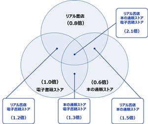 2016年5月~2017年4月のhonto会員の調査の結果、本の通販ストア、電子書籍ストア、リアル書店の3チャネルを併用する会員の購入金額は、全体平均を「1」とした場合「2.1」倍と、最も高くなりました。また、複数チャネル利用者の1人当り購入金額は、総じて単一チャネル利用者よりも高くなっています。