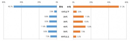 男女比はほぼ均等で幅広い年代の方にご利用いただいております。