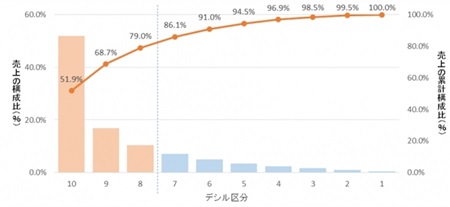 ※デシル分析:リアル書店の店舗、本の通販ストア、電子書籍ストアの利用者の総購入金額を合計し、累積購買額の多い順番に並べ、人数で10等分にした集計値。