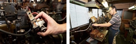 鉛などの金属を溶かし、活字の型である母型に流し込み、一本ずつ活字を作ります。