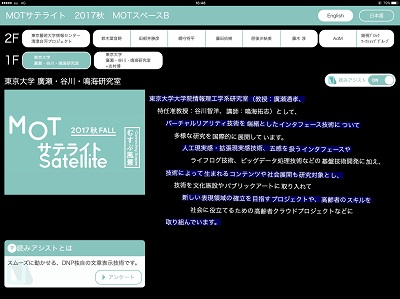 DNPの文字情報伝達インタフェースを搭載した展示支援システムは、開催期間中、展示会場の1つとなるグランチェスター・ハウス(清澄白河エリア)の1・2階に1台ずつ設置するタブレット端末で利用できます。DNPはこの展覧会を通じて、作品解説の読みやすさなどのユーザー評価を獲得するとともに、今後の機能拡張に必要な検証などを行います。