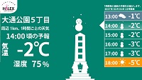 近6時間の「ジャストポイント天気予報」を提供します。HTML5*1やWebSocket*2等を使うことで、デジタルサイネージ表示とテレビ放送をスマートフォンで簡単に切り替えられる機能を実現しました。災害発生時には、テレビ放送に切り替えることで、最新の災害情報を見ることができます。