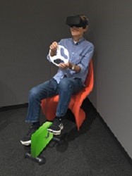 今回出展した「シニアVRトレーニングサービス」は、高齢者がVRコンテンツを鑑賞しながら、足こぎペダルとハンドルの操作による軽度な運動をすることで、運動不足の解消を促し、健康寿命の延伸につなげていくシステムです。軽い運動と、旅行気分を味わえるコンテンツを通じてVR空間内を回遊しているような体験ができるため、楽しみながら継続していくことができます。