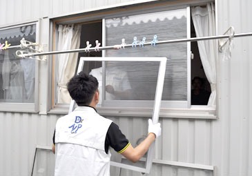 当日は清掃を希望するお宅で、換気扇やエアコンフィルターの清掃、畳へのカビ防止剤散布、窓への断熱スプレー塗布や網戸の清掃等を行いました。2日間で約40件のお宅にうかがいましたが、高い所や屋外での掃除ボランティアはとても喜ばれました。
