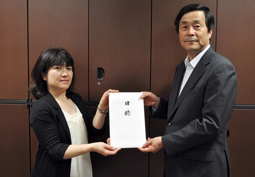 大日本印刷(DNP)グループは、東日本大震災の継続的な復興支援の一環として、2011年より、被災した学校図書館の復興を支援する「学校図書館げんきプロジェクト」に寄付を行っています。2013年度分として、7月28日に同プロジェクトの事務局を訪問して目録を贈呈し、262万9,468円の寄付を行いました。寄付金は、生徒の学習に役立つ蔵書の購入に充てられます。