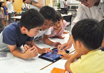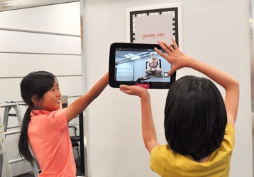 タブレットPCとAR*マーカーを使い、ルーヴル美術館の作品を会場内に本物さながらに展示、撮影する体験は、参加した子どもたちばかりでなく保護者の方たちも一緒になって楽しみ、また、実際の作品の大きさを実感する機会となった様子でした。