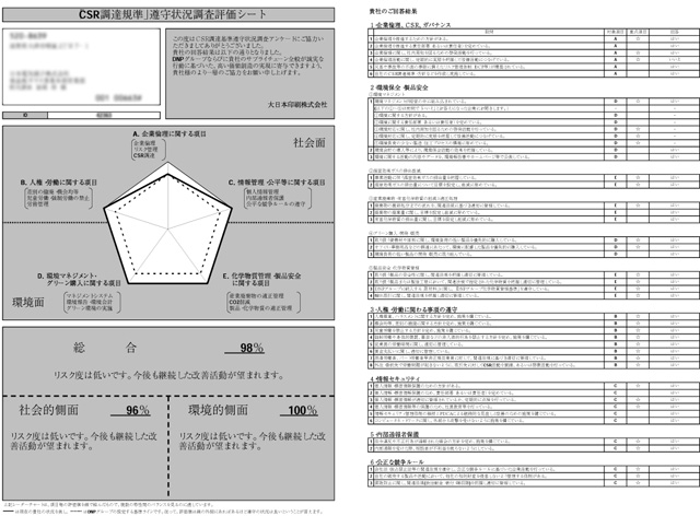 DNPは、バリューチェーン全体が社会適合性を高めた活動となるよう、DNPとサプライヤー各社が遵守すべきものとして「DNPグループCSR調達規準」を制定しており、定期的にサプライヤー各社の遵守状況とその課題点の把握を目的とした調査を実施するとともに、評価結果のフィードバックを行っています。