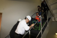 また、本社のあるC&Iビルでは、突然の怪我や障がいがあるなど自力歩行が困難な方の確実な避難のために、非常用階段避難車を使った搬送訓練も取り入れました。