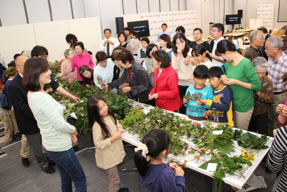 第4回セミナー(11/1)では『都会の緑』をテーマとして、前半は『都会の緑』の一例である企業緑地について、(株)インターリスク総研の原口真氏と三井住友海上保険(株)の浦嶋裕子氏にお話いただきました。また後半は、普段の生活の中でもみどりを楽しむ方法として、葉っぱを使ったワークショップを実施しました。公益財団法人キープ協会の中山孝志氏のファシリテーションで、20種類以上の葉っぱを使って大きさや形で勝負する「葉っぱじゃんけん」やブックカバー作りを行いました。