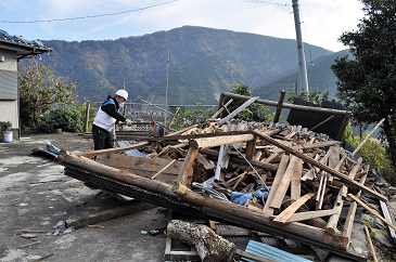南阿蘇村立野地区は熊本地震による道路損壊や断水、地震後の大雨による土砂崩れもあり、インフラ被害のほか183世帯の住宅が半壊以上となりました。2017年10月31日、360世帯に出ていた長期避難指示が解除されましたが、現在でも災害の爪痕が色濃く残っています。今回は、発災後1年半が経ち、ようやく立ち入りが認められるようになった南阿蘇村立野地区で、被災された住民の方々とボランティア社員が一緒になって作業を行いました。
