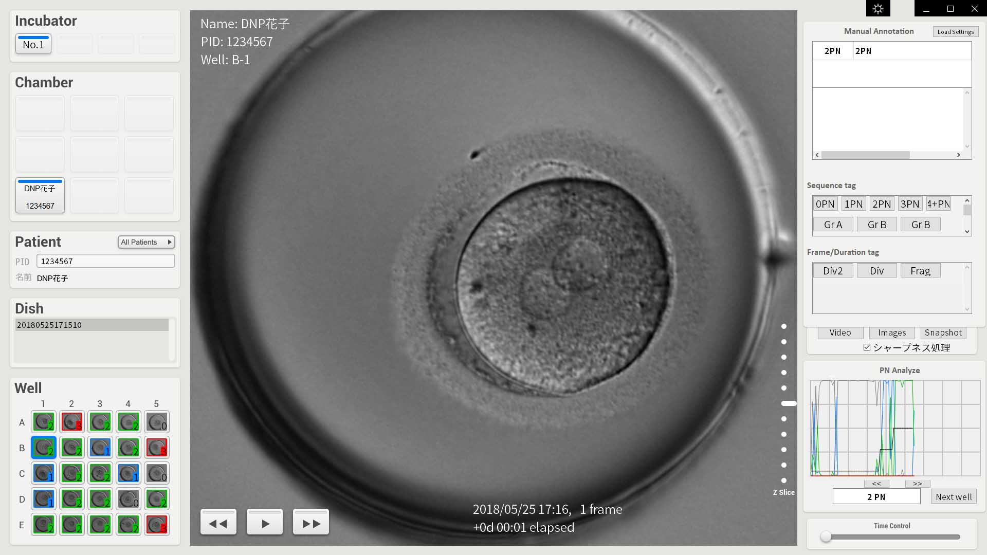 患者の複数の受精卵がそれぞれ正常に受精しているかを判断するため、胚培養士が前核の確認を行いますが、前核の確認には技量と多くの時間を要します。本ソフトはディープラーニング技術を用いて、撮影された画像を解析し、受精卵の前核を自動検出することで観察作業を効率化し、培養士の負荷を軽減します。