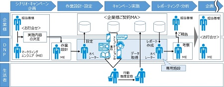 DNPは、企業が保有する購買履歴をはじめとする顧客データを分析し、販促に導く仮説の立案からコミュニケーション施策の企画・実行・検証までをトータルに実施するデジタルマーケティング関連事業を展開しています。今回開始したサービスでは、高度な情報セキュリティ体制のもと、キャンペーンなど各種施策の企画・設計に長けたマーケティングエンジニアと、各種MAツールの専門オペレーターが、企業の担当者のMAツールの運用を支援・代行することで、デジタルマーケティングに関わるオペレーション教育コストや業務負荷を軽減するとともに、販売の増加など効果的なマーケティングの実行を支援します。