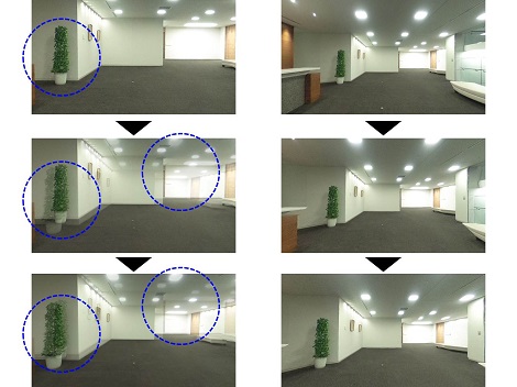 従来の360度パノラマVRは、撮影した位置から360度を見回す表現はできましたが、撮影した位置以外から見た光景は表示できませんでした。今回の高品位パノラマVR技術では、2つの地点で撮影したパノラマ写真に記録された被写体の位置を解析することで、撮影した2地点間の、どの位置からでも360度の光景を再現することができます。